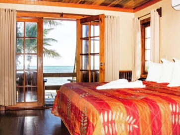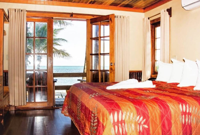 Located on the lower level of our Two Story Cabanas and separated by an open air breezeway these Beachfront rooms provide stunning views of the Caribbean Sea and the Belize Barrier Reef. Each room is appointed with Mahogany floors, locally handcrafted cabinetry, table and chairs for two, and French Doors opening onto your beachside veranda. Recently remodeled to include larger showers with a bench and new Vanity tops. Our Beachfront King units feature a king bed and sleep two. Amenities include beach view, air-conditioning, coffee maker, compact refrigerator, hair dryer, WiFi hotspot, in room safe, iPod dock, iron, and verandah with chairs.